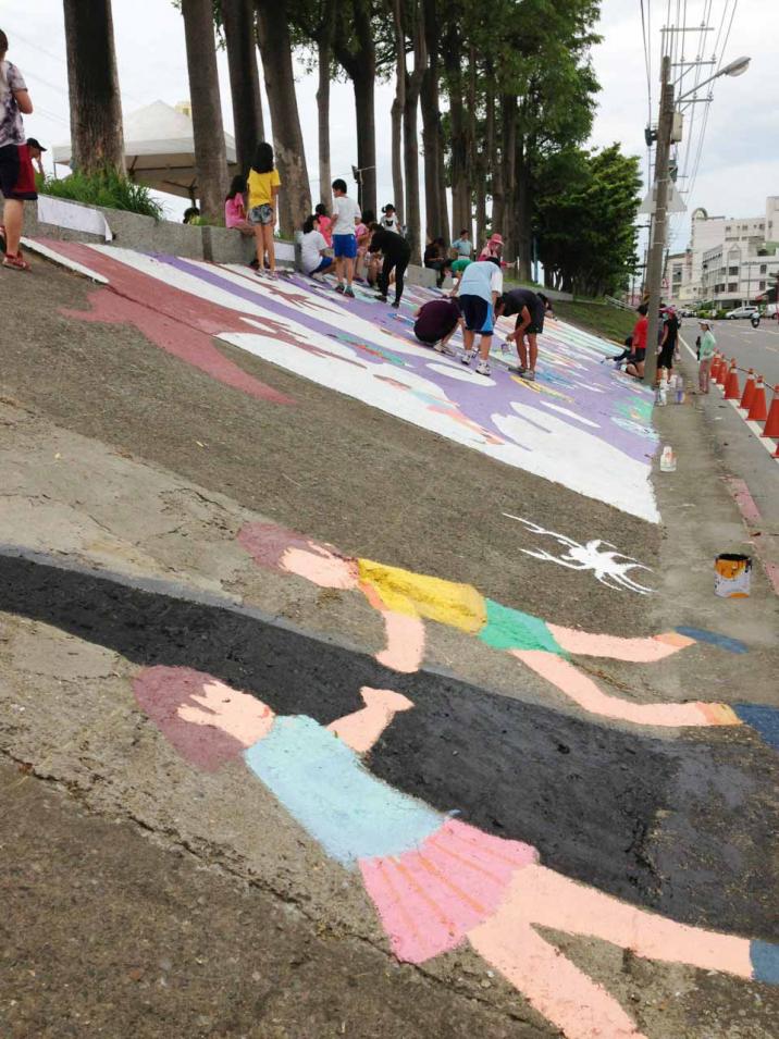 為協助海佃國中、國小師生彩繪河堤,志工放下手邊工作,幫忙調顏色、指揮交通、煮中餐,陪伴孩子們創作,路過的行人紛舉起大拇指稱讚。