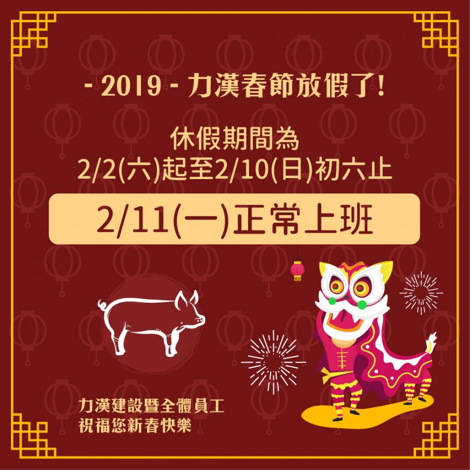 力漢建設春節休假期間為 1/23(四)起至1/29(三)初五止 於1/30(四)初六正常上班 力漢建設戀家17接待中心 春節於地址:新市區大營里252號旁