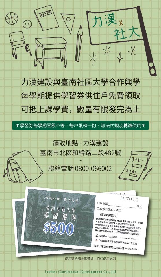 力漢建設與臺南社區大學合作興學,每學期提供學習券供力漢住戶免費領取。 *學期券可抵社大上課學費,數量有限發完為止* 跟著力漢一起快樂學習,好好生活Leehen Making Learning Fun {台南社大網站}